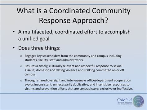Each ccr team creates its own specific goals, but most ccrs have goals around the following key areas: An annotated list of best practice resources for coordinated community response teams. A coordinated community response approach ensures a timely, culturally relevant, and respectful response to sexual assault, domestic violence, dating violence, and stalking.
