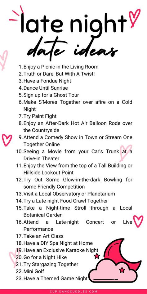 Late Night Date Activity Ideas. Try stargazing, midnight picnics, nighttime kayaking, ghost tours, bowling, karaoke, board games, diy projects, or spa nights at. Welcome to the ultimate guide for couples seeking to spice up their nighttime rendezvous!