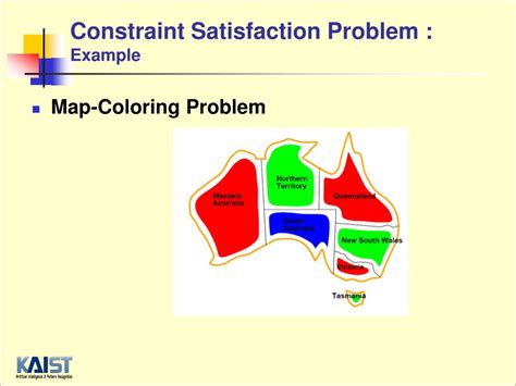 Awasome Constraint Satisfaction Problem Map Coloring. Adjacent regions must have different colors˜ e.g., wa nt,. Q a set of variables x1,x2,.,xn with domains (possible values) d1,d2,.,dn q a set of constraints c1,c2,.